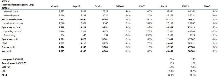 - BMRI Oct-25 net profit reached IDR 4.1 tn (-1.3% MoM; +0.8% YoY), bringing 10M25 net profit to IDR 38.9 tn (-9.7% YoY).